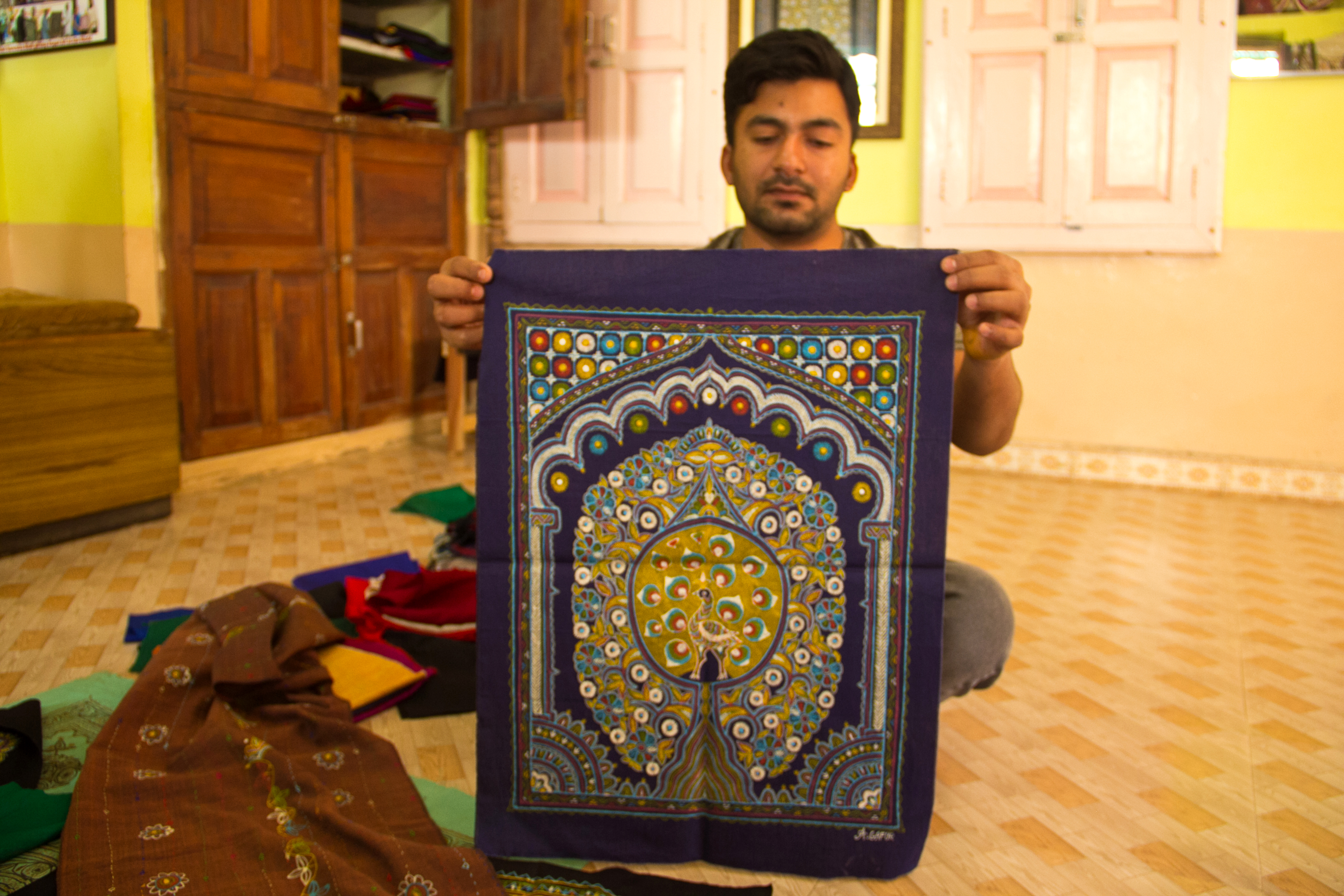 Rogan painting is a unique craft and practiced by very few families. Rogan painting involves the use of a thick paste which is prepared by boiling the oil of safflower, caster or linseed and pouring it into water. This paste is mixed with chalk colour pigment and a binding agent to form a thick dye. The painting on the cloth is done using astick rod or a metal block. Geometric and floral designs are the norm. Red, blue and yellow are the usual colours that are employed. Rogan printing is used for decorating wall hangings, table-cloth, curtains, sarees and skirt borders.
